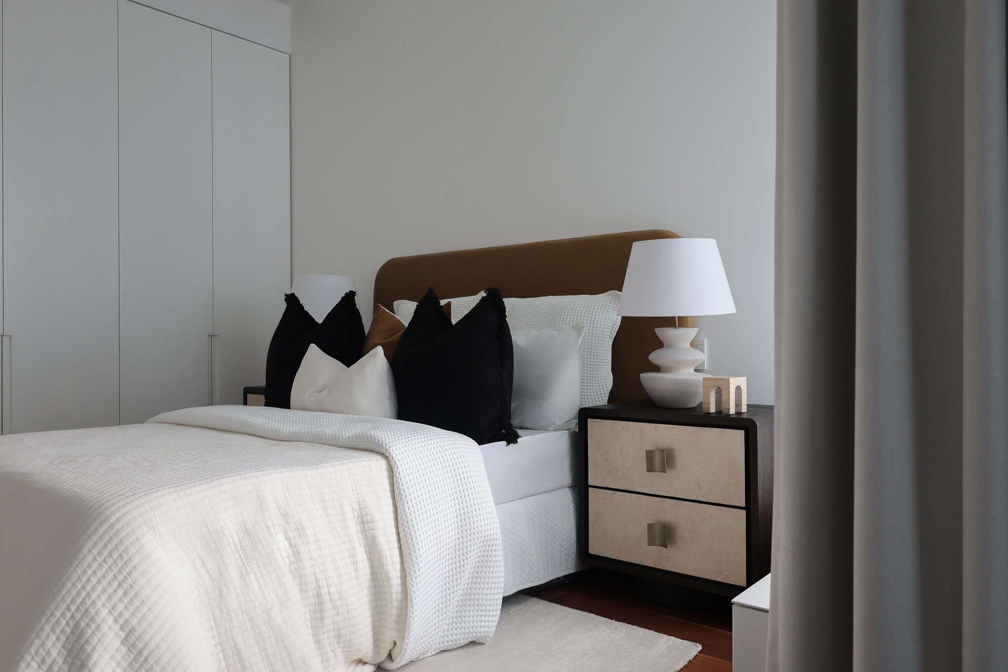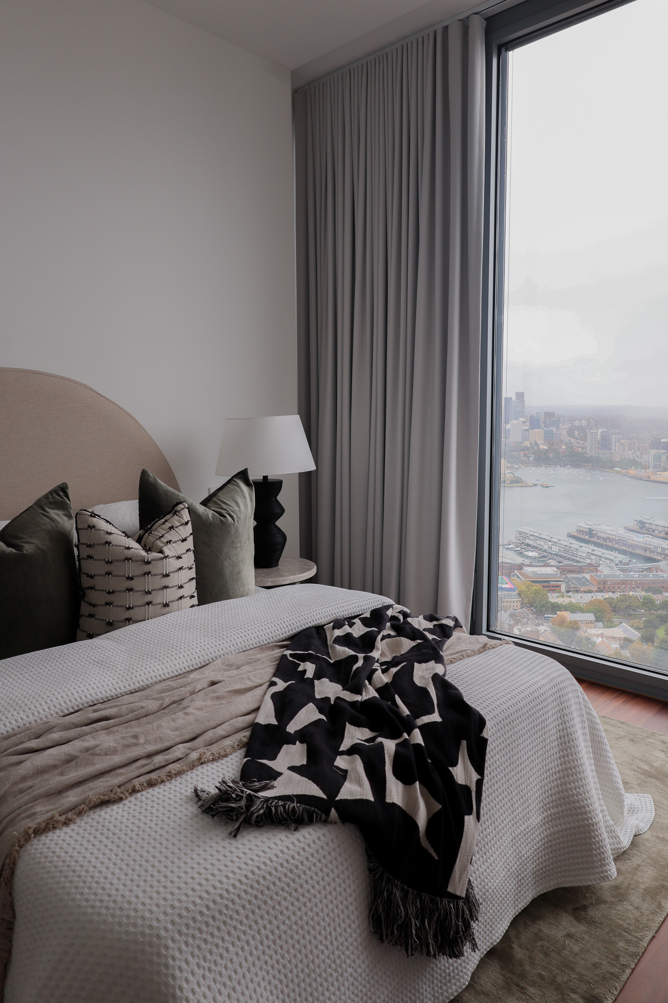 We styled this luxury Barangaroo apartment to honour its breathtaking Sydney Harbour outlook, creating an interior that feels both elevated and effortlessly liveable. A refined, neutral palette was layered with rich textures and sculptural furnishings to frame the view without competing with it, allowing the harbour to remain the hero from every angle.